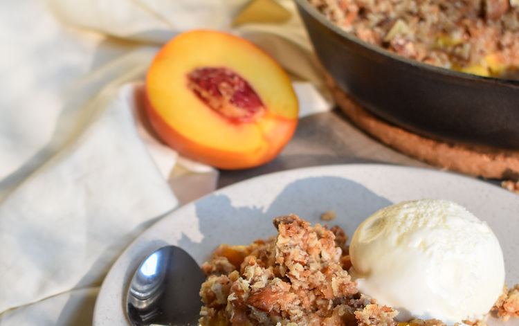 Nous avons revisité la croustade traditionnelle en incorporant un peu plus de protéines avec la PVT* (protéine végétale texturée) et les amandes. La saison des pêches et des nectarines de nos voisins du Sud bat son plein, c'est la recette parfaite pour les apprêter!
